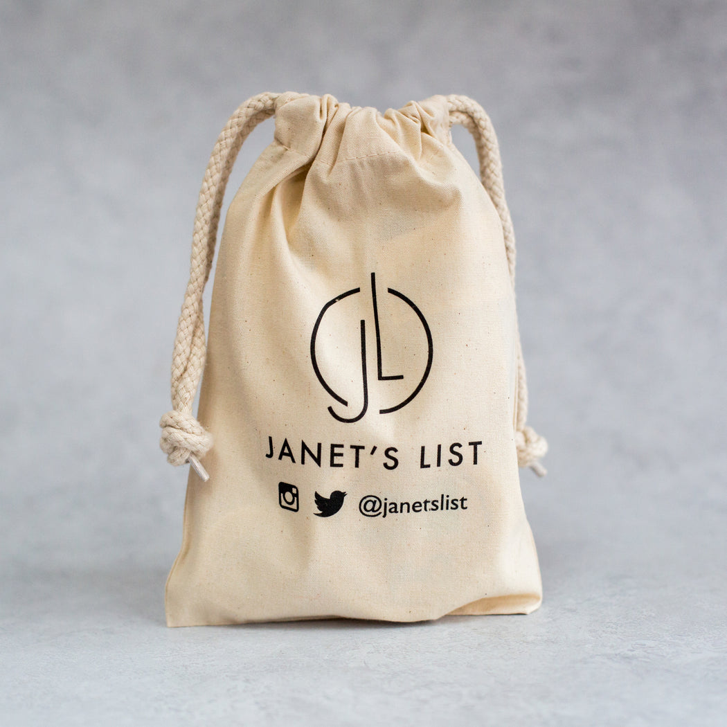 Janet's List Mini Travel Bag: Our mini drawstring travel bag is great for holding your products and accessories. It is durable, made using organic cotton and great for stowing away all of your products for anyone on the go.